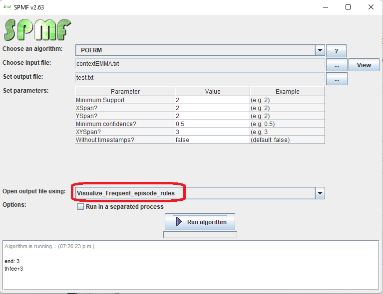 1) First, select an frequent episode rule mining algorithm offered in SPMF. Several algorithms are offered and are described in the documentation of SPMF.