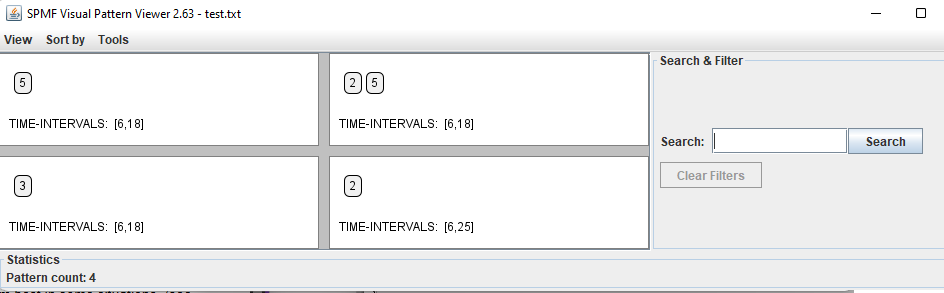 After the algorithm terminates, the discovered patterns will be displayed using the Visual Pattern Viewer: