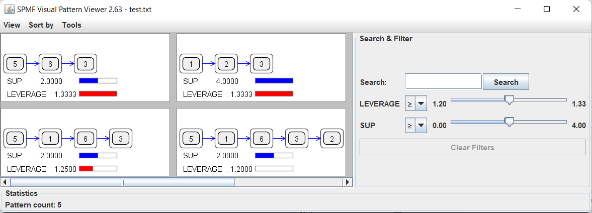 - A tool (VisualPatternViewer) to visualize patterns (screenshot). It works with patterns discovered by most algorithms such as itemsets, sequences, episodes and association rules. This tool can be used in the graphical interface of SPMF by selecting for "Open output file using" the option and then "Visualize (pattern type) " . This option is available for most algorithms with a few exceptions.