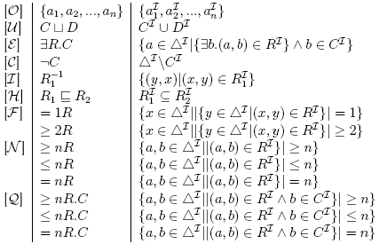 R.C évoque l'ensemble des individus du domaine d'un rôle R qui sont en relation, par le biais de R, avec un individu du concept C, pour une interprétation donnée. Par exemple, pour une interprétation I qui est un modèle de l'ABox et de la TBox du tableau 1.1,