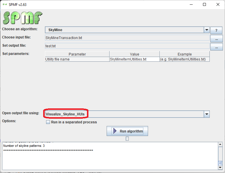 2) Then, in the user interface of SPMF, after selecting an algorithm and setting its input file path, output file path, and parameters, click on the combo-box besides "Open output file using:", and select "Visualize_Skyline_HUIs" so that the discovered patterns will be opened with the visual pattern viewer.