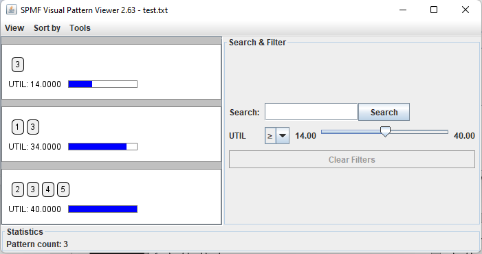 On each line, the items of the itemset are first listed. Each item is represented by an integer, followed by a single space. After, all the items, the keyword " #UTIL: " appears and is followed by the utility of the itemset. For example, we show below the output file for this example.For example, we show below a pattern file with 3 patterns: