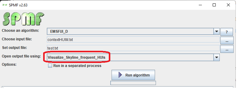 2) Then, in the user interface of SPMF, after selecting an algorithm and setting its input file path, output file path, and parameters, click on the combo-box besides "Open output file using:", and select "Visualize_Skyline_frequent_HUIs" so that the discovered patterns will be opened with the visual pattern viewer.